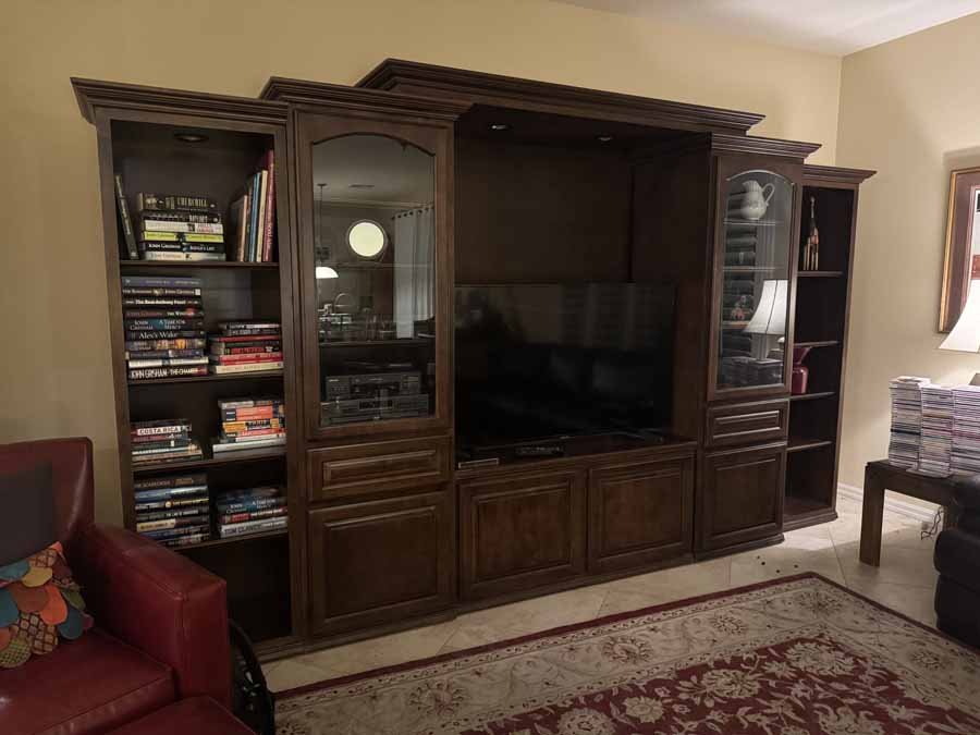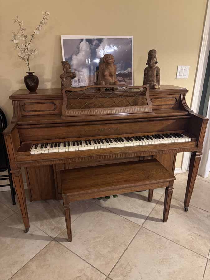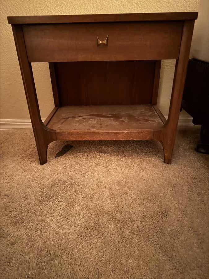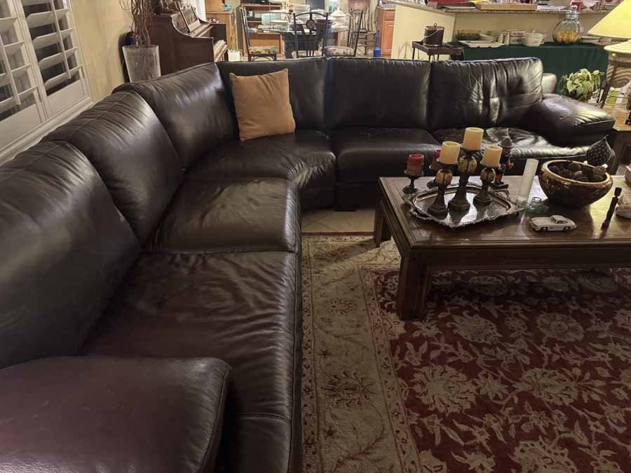 BROYHILL PREMIER "BRASILIA" MID CENTURY MODERN BEDROOM SET, PIANO, LARGE LEATHER SECTIONAL, COSTUME JEWELRY, TRUNDLE DAY BED, ARTWORK, WALL UNIT, DINETTE SET, DININGROOM SET, KITCHENAID MIXER, PATIO FURNITURE, GARAGE SHELVING, DINNERWARE, "GOLD" FLATWARE, AND LOTS MORE!